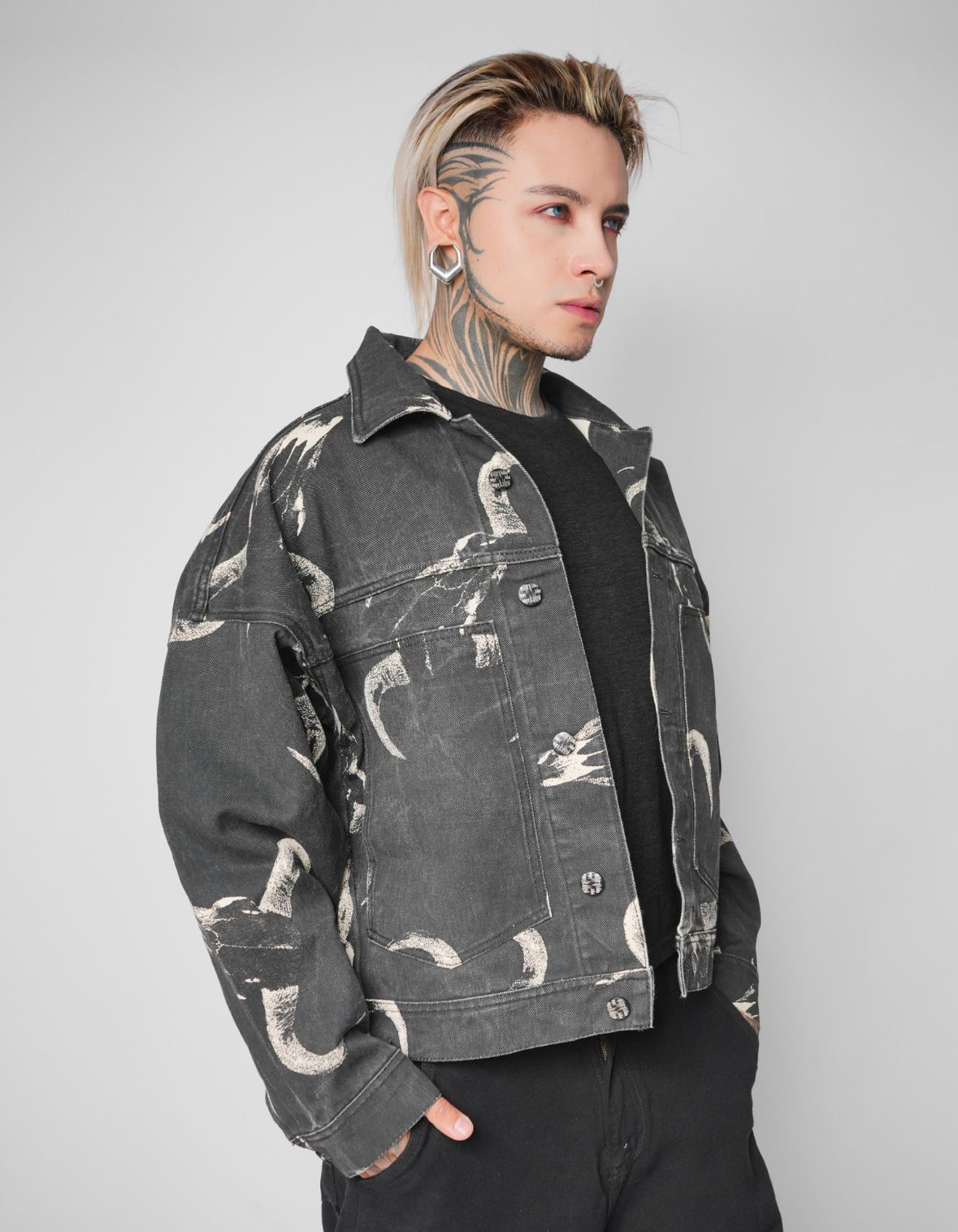 Una chaqueta que parece capturar movimiento en cada trazo. Su estampado, hecho de curvas y formas que recuerdan cuernos, llamaradas o criaturas abstractas, crea un efecto dinámico y casi animal. El fondo en denim oscuro hace que los trazos claros resalten con fuerza, dando una estética cruda, indómita y poderosa.